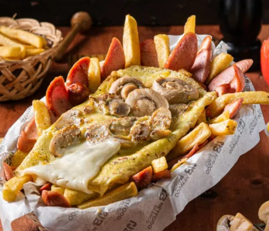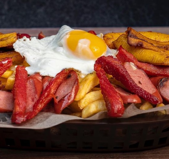 Papas fritas, huevo, queso y escoge dos proteínas: hot dog Frankfurter, pollo en trozos o chorizo.