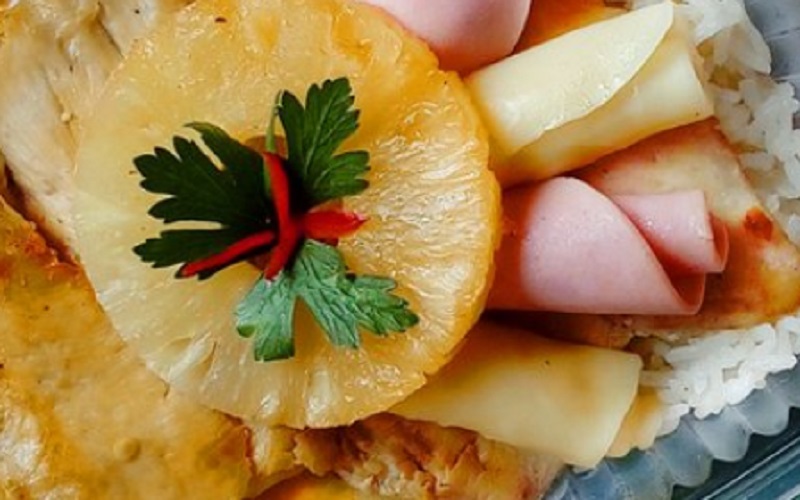 Arroz blanco, guarnición a elegir, pollo a la plancha acompañado de piña, jamón y queso.