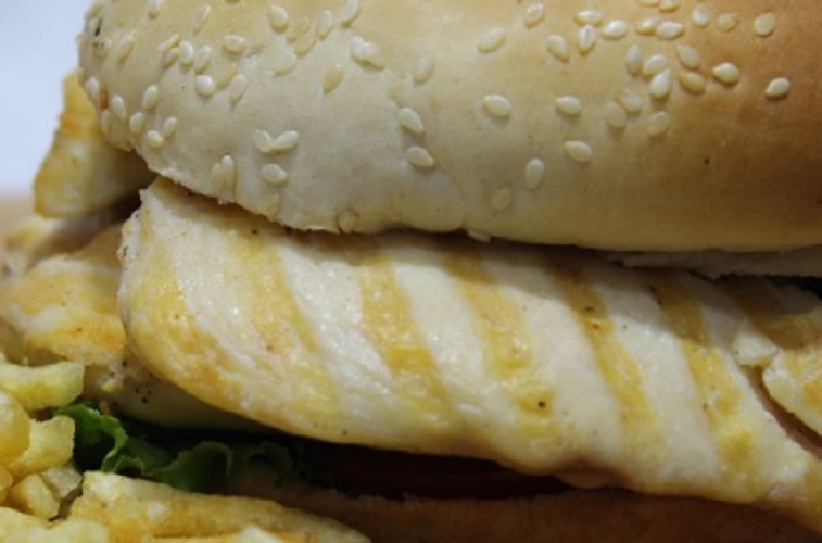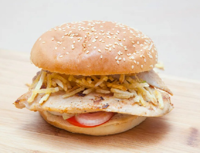 Pan hamburguesa, filete de pollo, lechuga y tomate, acompañado de papas al hilo.