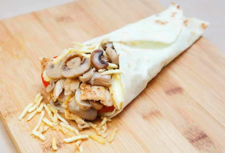 Pollo deshilachado con champiñones salteados, queso blanco, queso crema, lechuga y tomate envueltos en tortillas de harina de trigo.