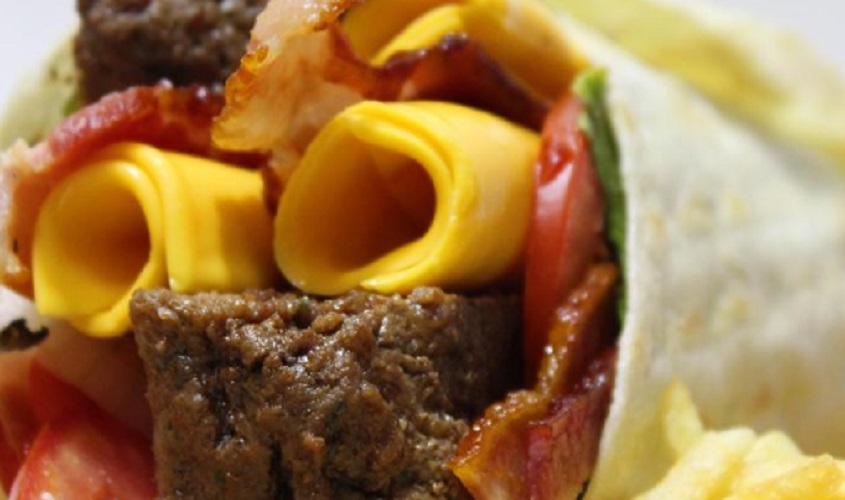 Hamburguesa de la casa, papas al hilo, doble queso cheddar, lonjas de tocino, lechuga y tomate envueltos en tortillas de harina de trigo.