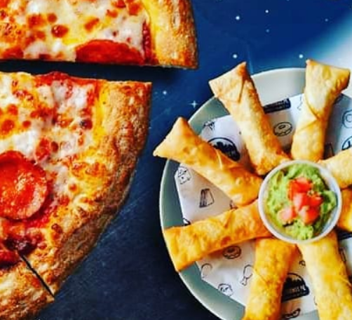 Pizza familiar hasta tres toppings más porción de 8 tequeños con queso.