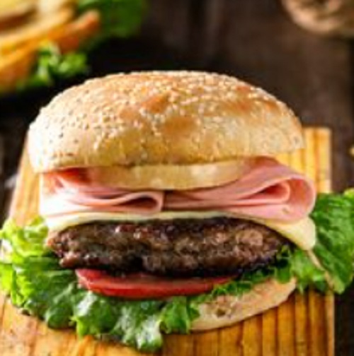 Pan hamburguesa, hamburguesa de la casa 200 g, queso blanco, jamón, piña, acompañada de papas al hilo.