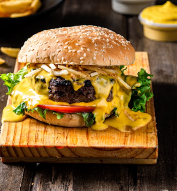 Pan hamburguesa, hamburguesa de la casa 200 g, doble queso cheddar acompañada de papas al hilo y cremas a elección.