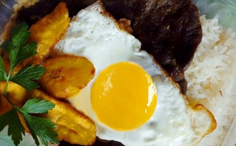 Arroz blanco, guarnición a elegir, filete de pechuga a la plancha acompañado de huevo y plátano frito.