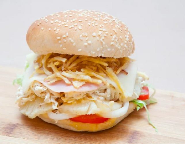 Pan de hamburguesa, milanesa de pollo, huevo frito, queso blanco, lechuga y tomate.