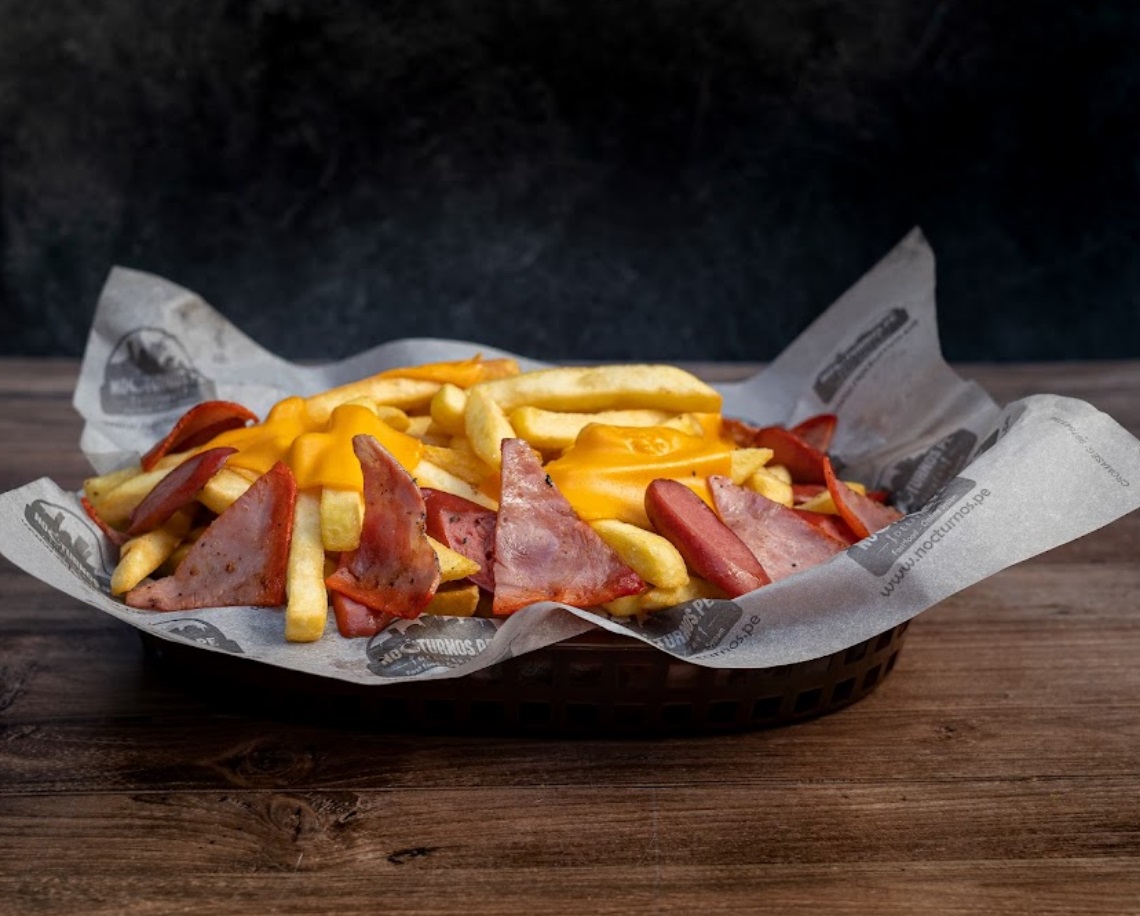 Papas fritas, hot dog frankfurter, tocino y queso cheddar acompañado de cremas de la casa.