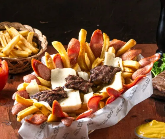 Papas fritas, hot dog frankfurter, chorizos en rodajas y trozos de pollo.