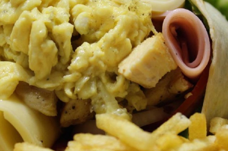 Pollo a la plancha, huevos revueltos, jamón, queso blanco, papa al hilo, lechuga y tomate envueltas en tortillas de harina de trigo.