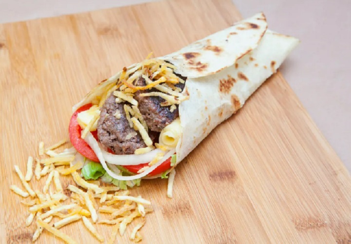 Hamburguesa de la casa, papas al hilo, doble queso blanco o cheddar, queso crema, lechuga y tomate envueltos en tortilla de harina de trigo.