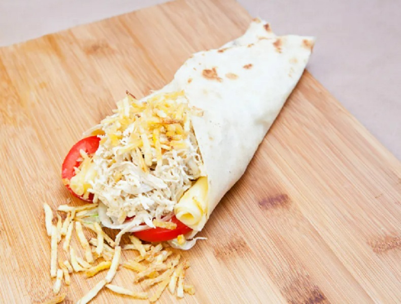 Pollo a la plancha, papas al hilo, doble queso edam o cheddar, queso crema, lechuga y tomate envueltos en tortilla de harina de trigo.