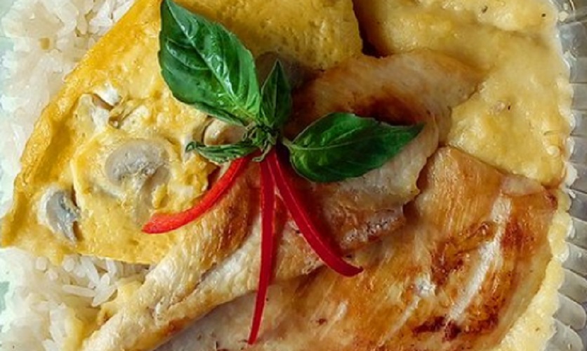 Arroz blanco, guarnición a elegir y omelette de champiñones acompañado de pollo a la plancha.