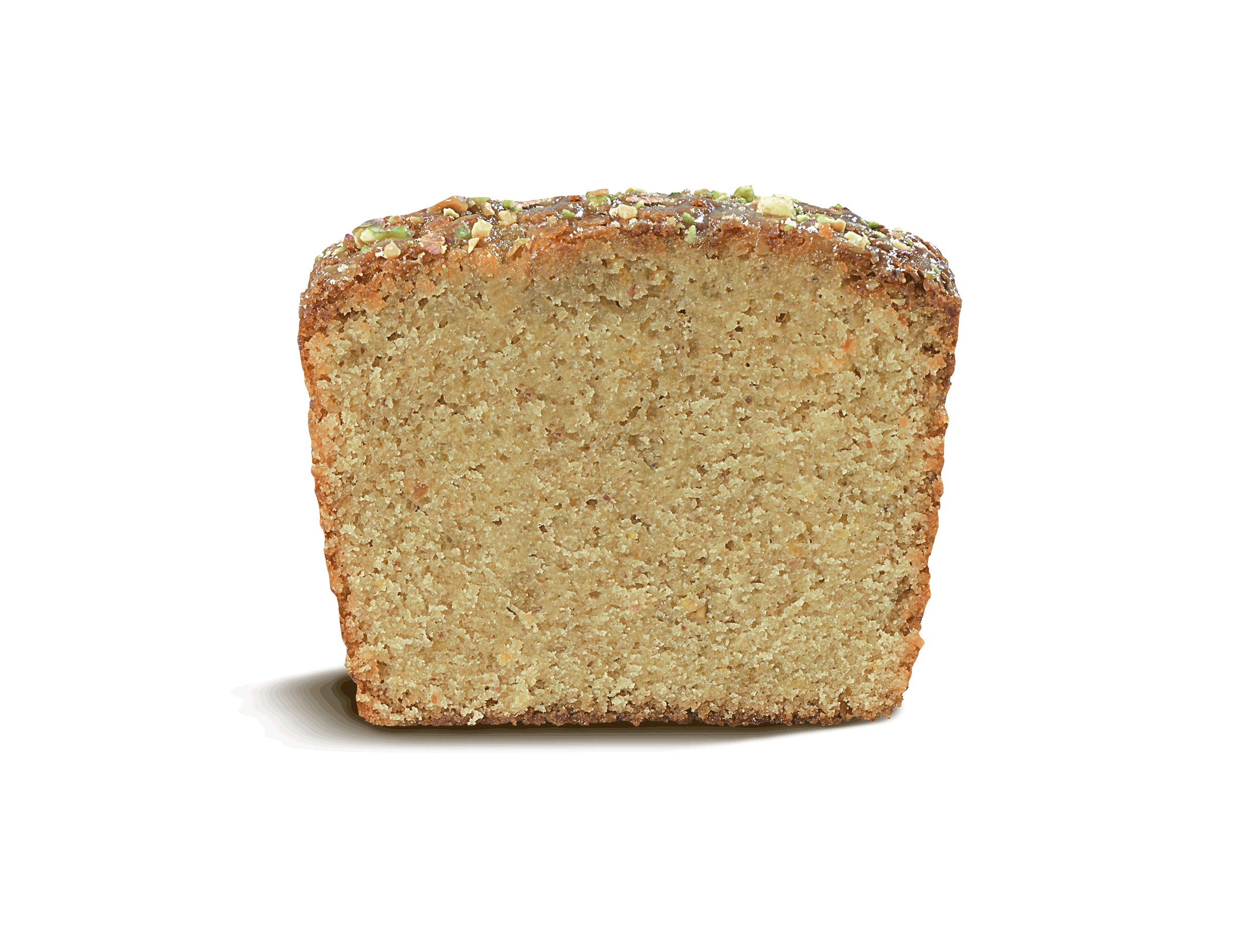 Queque a base de harina blanca, pistacho, cáscara de naranja, mantequilla, aceite vegetal, azúcar blanca, sal y huevo.