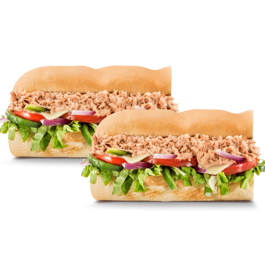 Disfruta 2 Subs con riquísimo atún, con queso, vegetales frescos y aderezos a elección, en pan recién horneado.