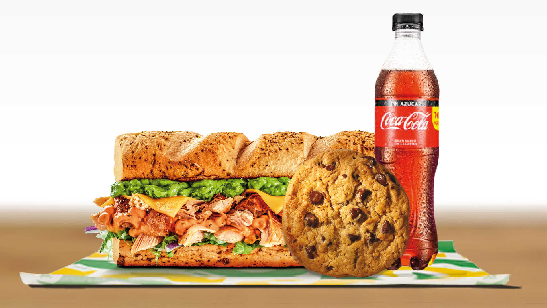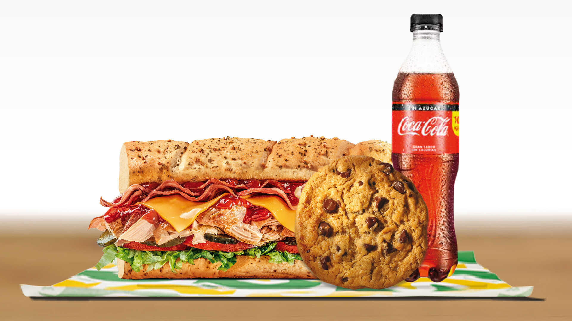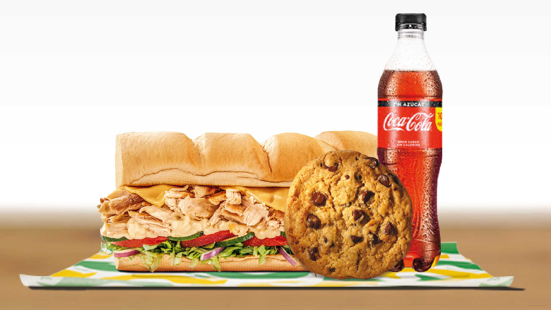 Rebanadas de pechuga de pavo, queso, vegetales y aderezos de tu elección. Incluye 1 bebida y 1 acompañamiento a elección.