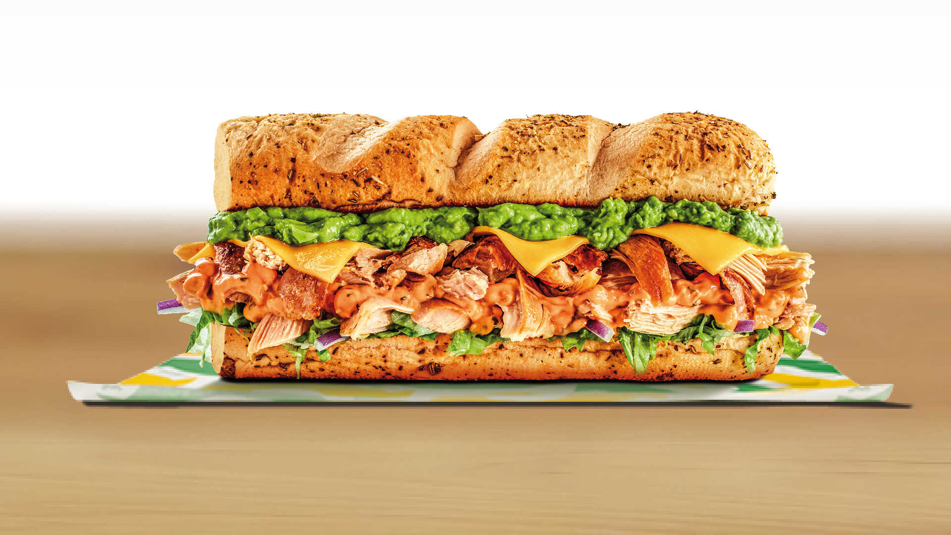 Nuevo Pollo Rostizado Mexicano. Combinación de pollo y palta. con pan de tu elección, queso, vegetales y aderezos.
