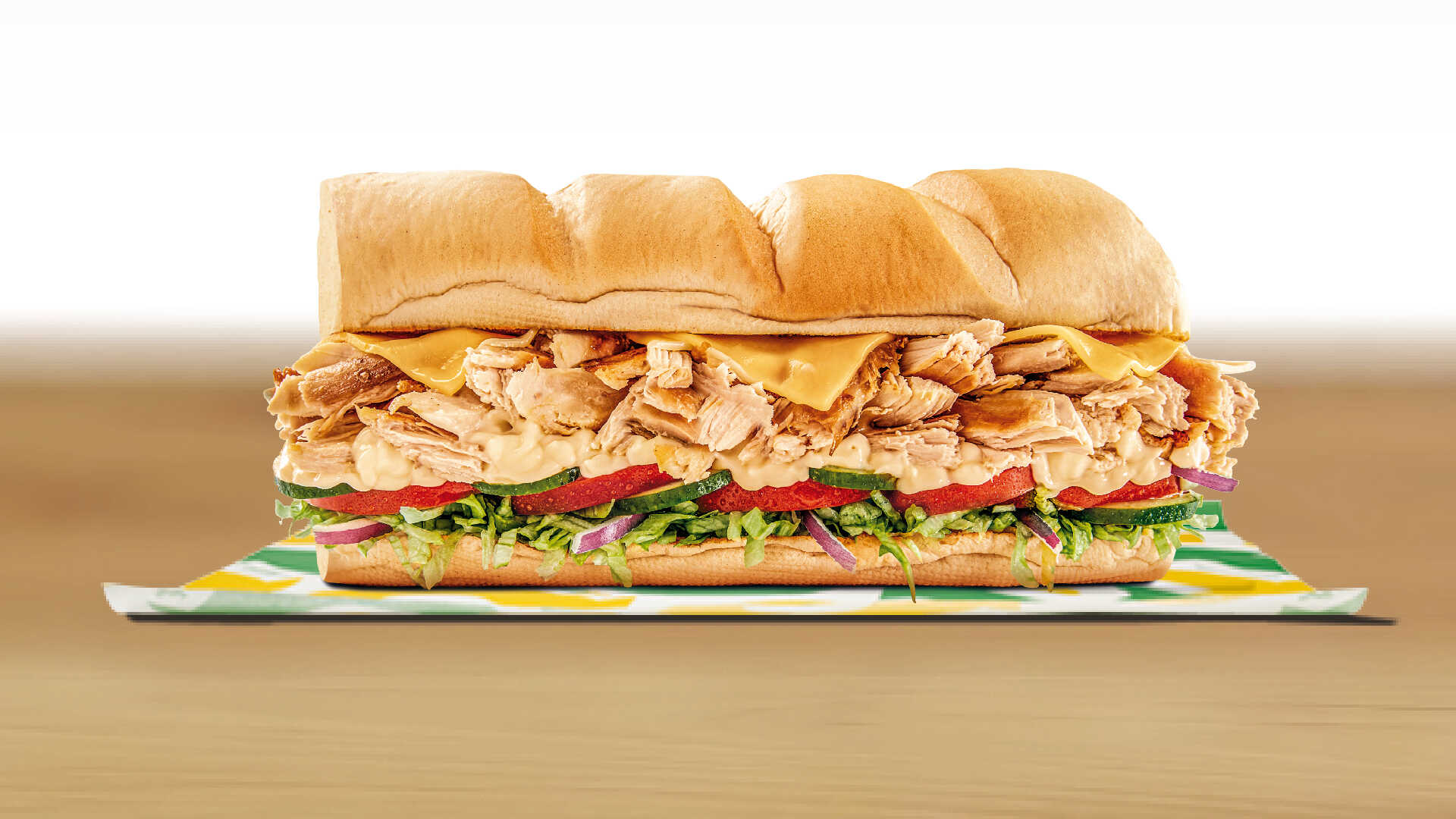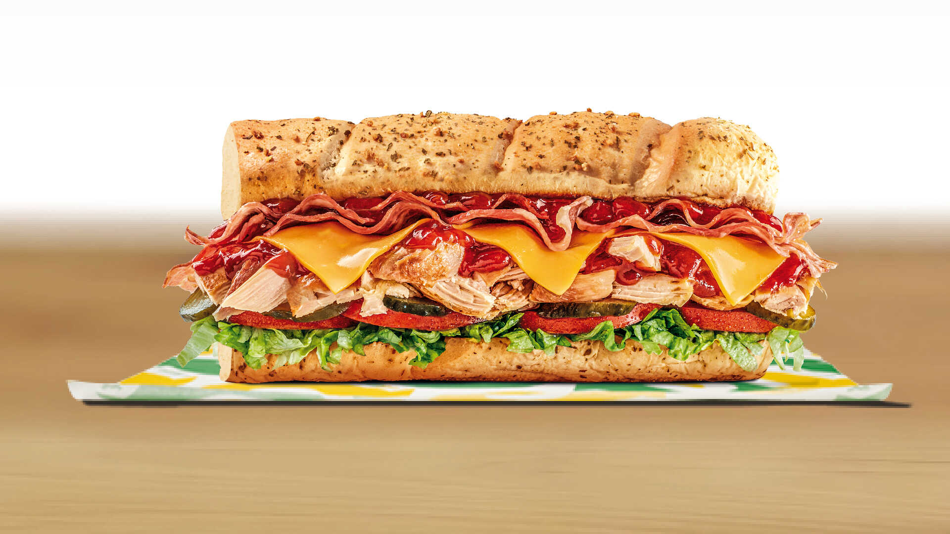 2 en Subs de pollo BBQ (tiras de pollo bañadas en salsa BBQ) y Pizzasub de 15cm (rebanadas de pepperoni, bañadas en salsa de pizza). Con pan de tu elección, queso, vegetales y aderezos.
