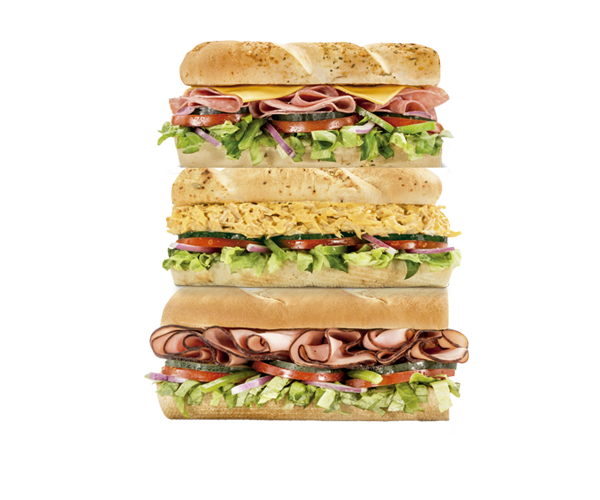Sub pollo mayoqueso 15 cm, Sub Salami 15 cm y Sub Jamón 15 cm. con pan de tu elección, queso, vegetales y aderezos.