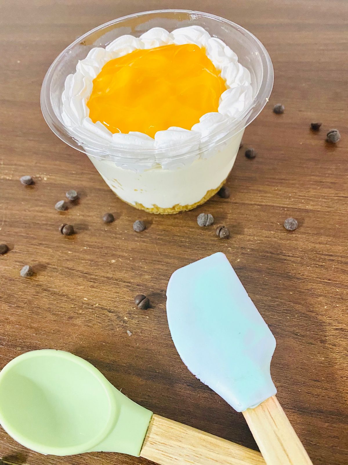 Base de galleta vainilla, queso crema, chantilly y maracuyá.