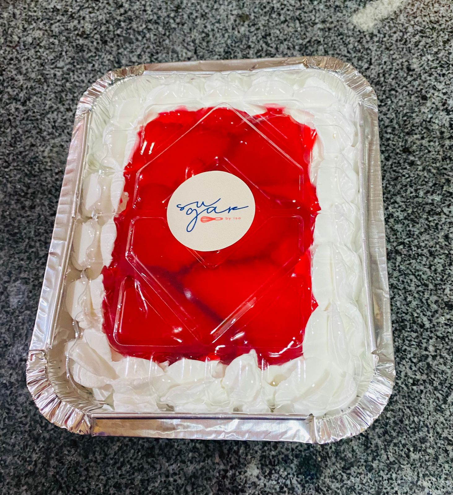 Base de galleta vainilla, relleno de queso crema con leche condensada decorada con fresas, jalea y chantilli