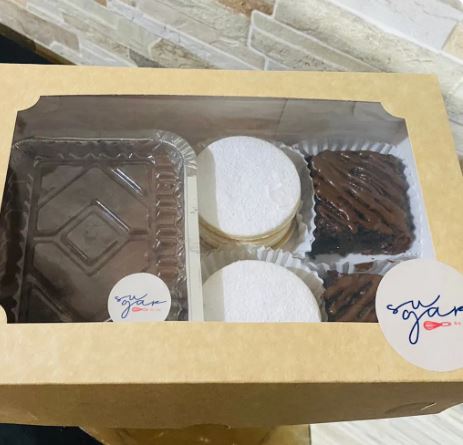 2 Brownies cubiertos de fudge casero, 12 mini alfajores y torta mini de chocolate casero.