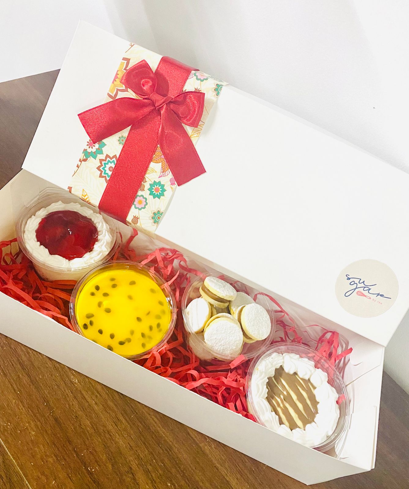 Bowl de cheesecake de fresa más 1 bowl de cheesecake de maracuyá, 1 bowl de cheesecake de sauco, 1 bowl de mini alfajores y 1 caja de regalo.