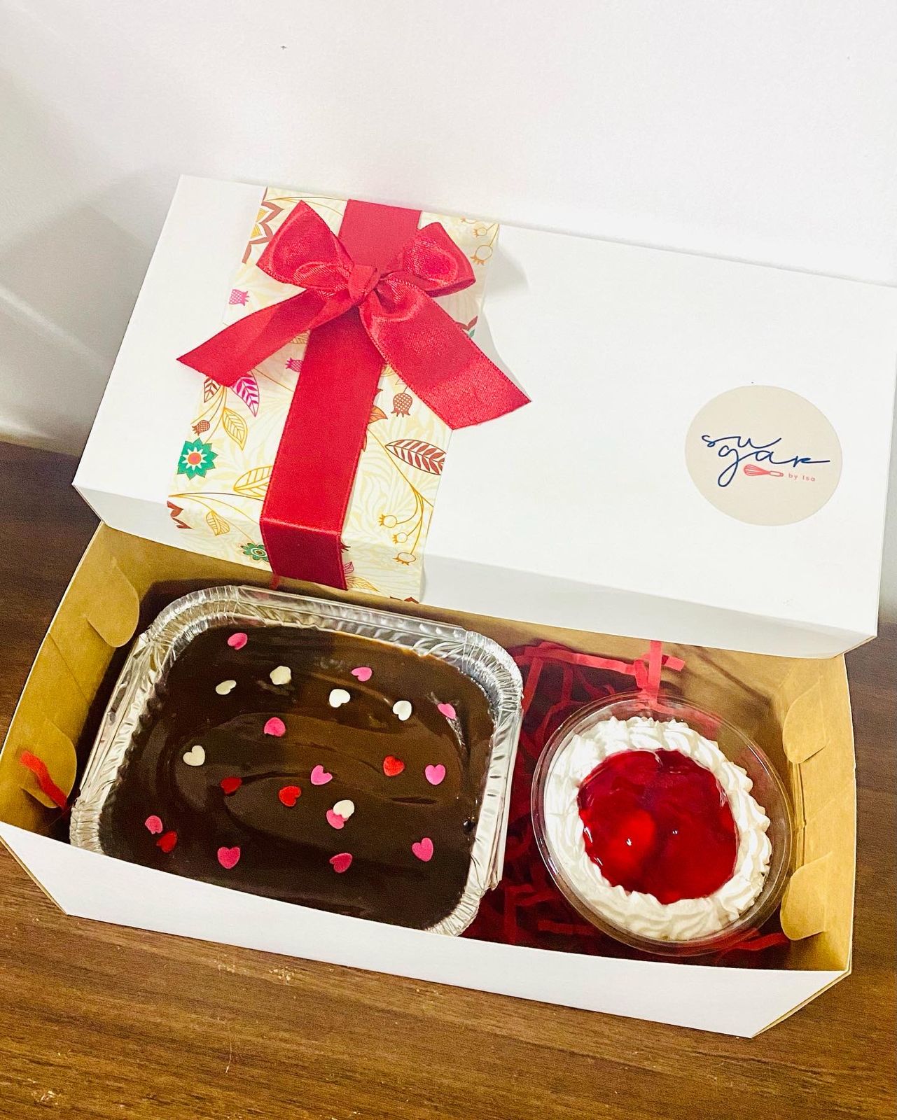 Incluye 1 mini torta de chocolate con fudge casero más 1 bowl de cheesecake de fresa y caja de regalo.