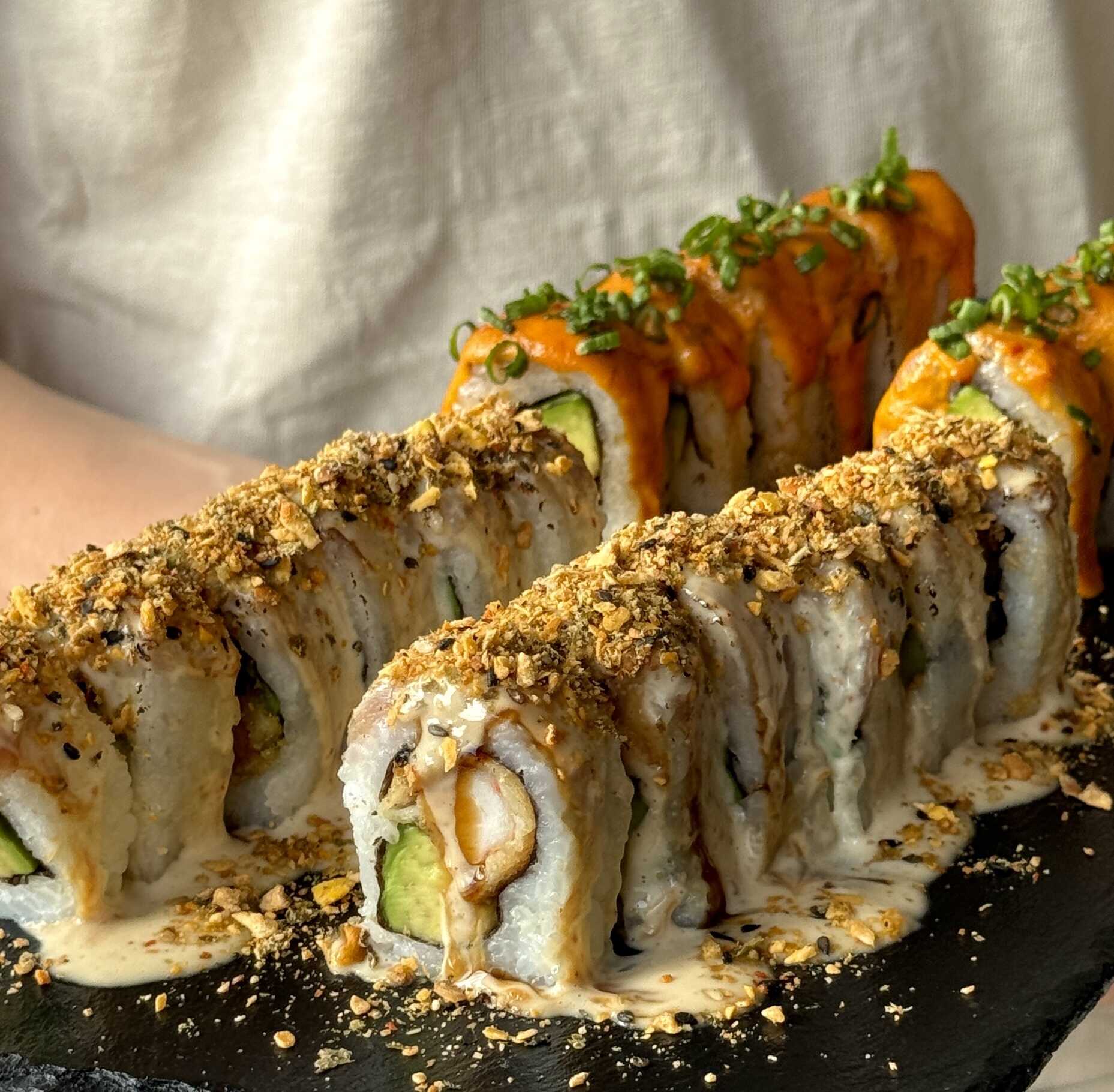 Relleno de Langostino y palta, cubierto con atun, nuestra salsa imperial flameada, cebollita china y tare.