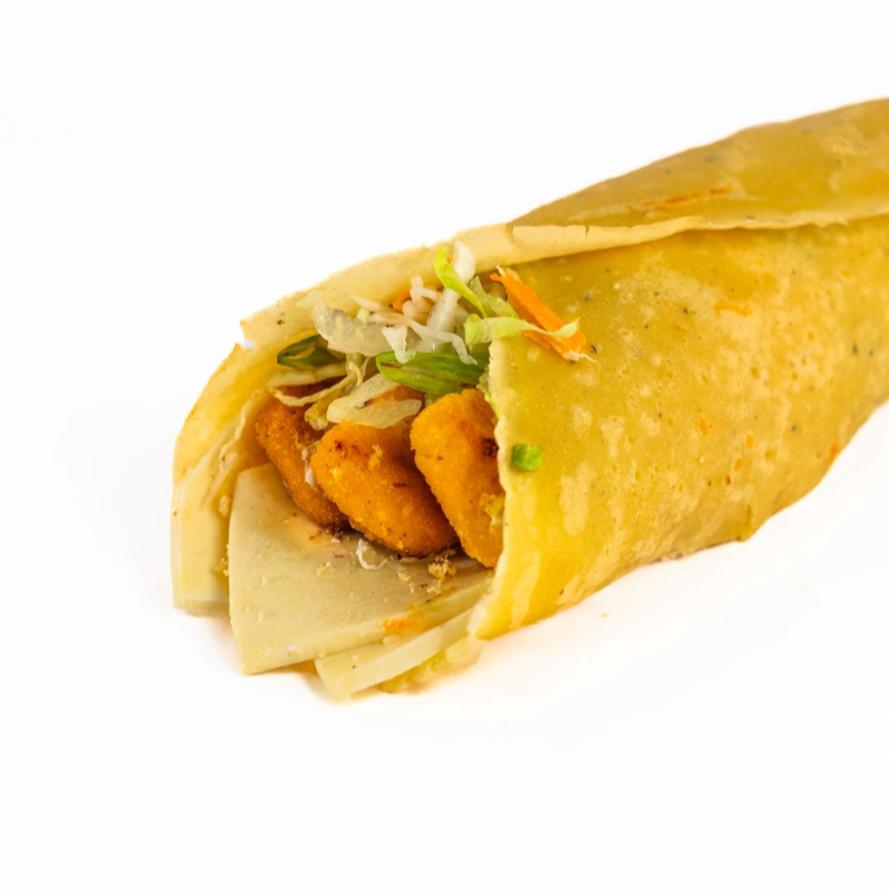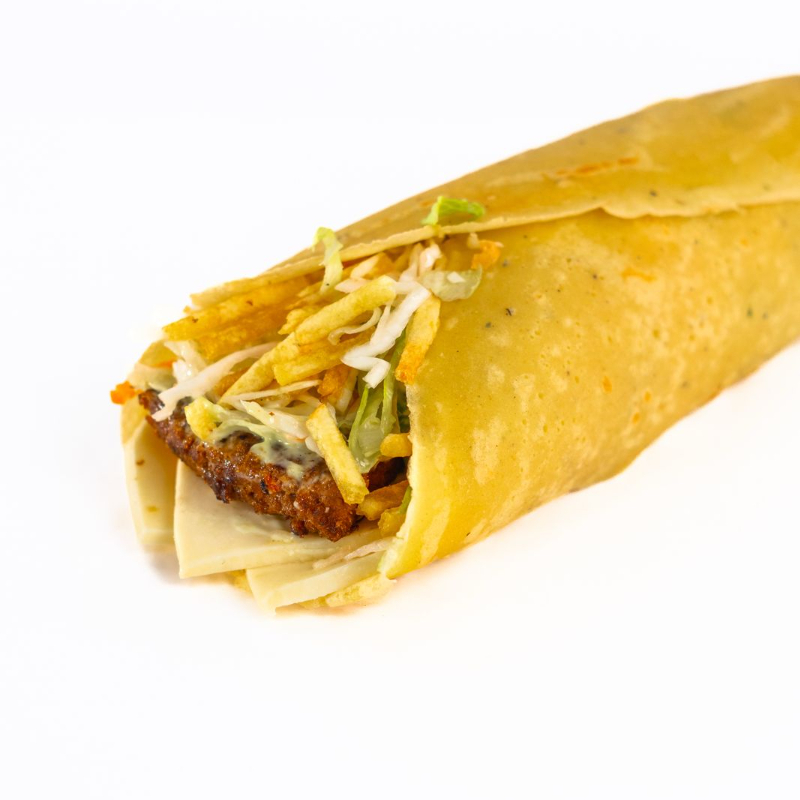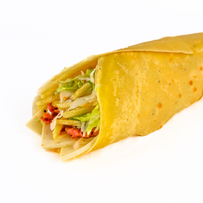 Tortilla, queso, filete de pollo, cremas y papas al hilo.