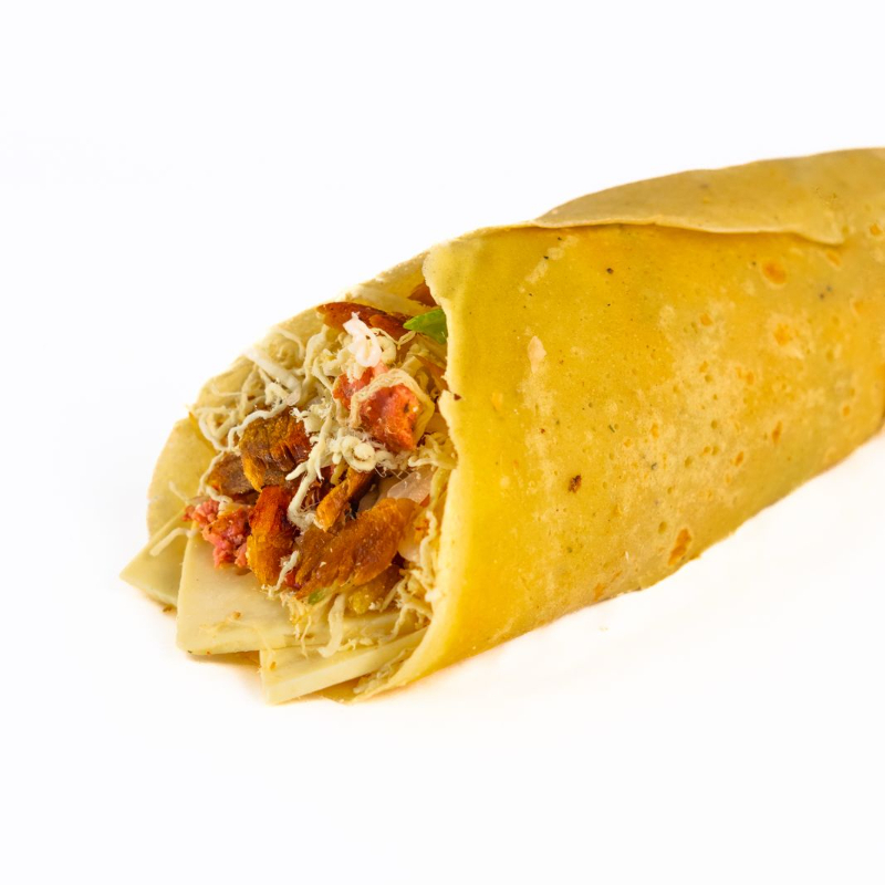 Tortilla, frejol, chorizo y pollo deshilachado.
