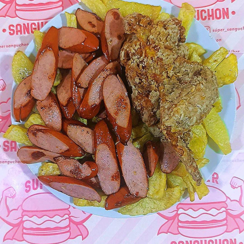 Sándwich de chorizo, pollo, cremas, papas al hilo y bebida a elección.