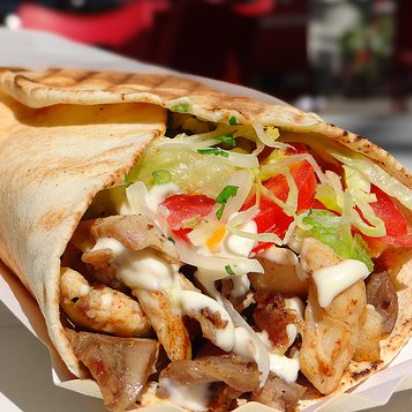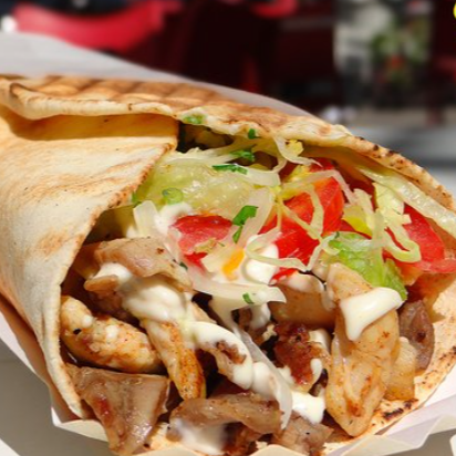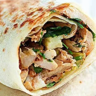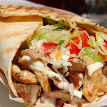 Shawarma con pollo ahumado, jamón, queso, papas al hilo, huevo, lechuga, tomate y cremas a elegir.