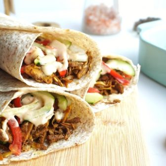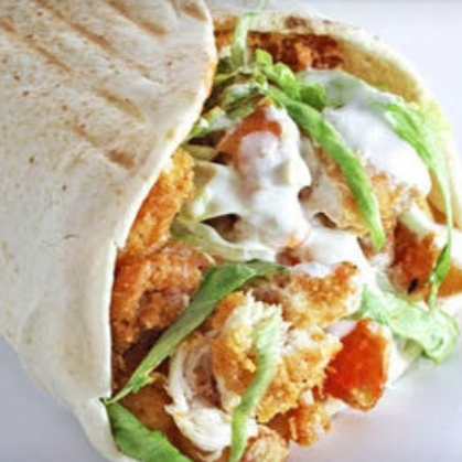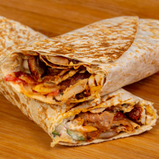 Shawarma con pollo ahumado, tocino frito, salsa de tabasco, queso, papas al hilo, lechuga, tomate y cremas a elegir.