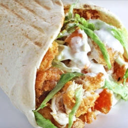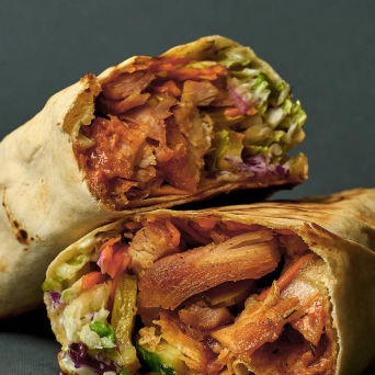 Shawarma con pollo ahumado en salsa de tamarindo, papas al hilo, lechuga, tomate y cremas a elegir.