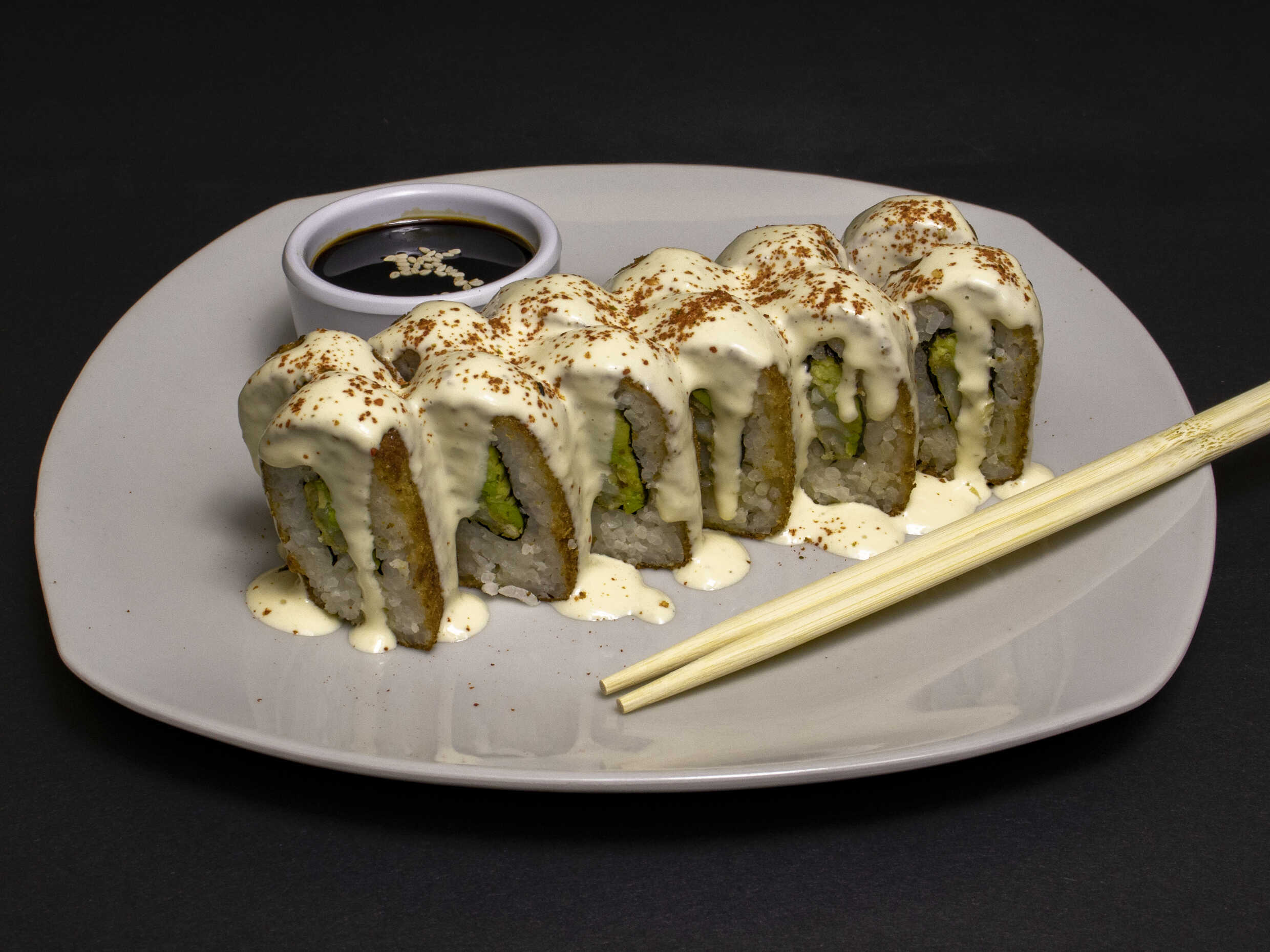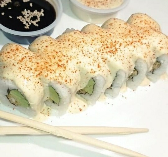 Queso crema y pescado furai cubierto de láminas de palta con salsa tare.