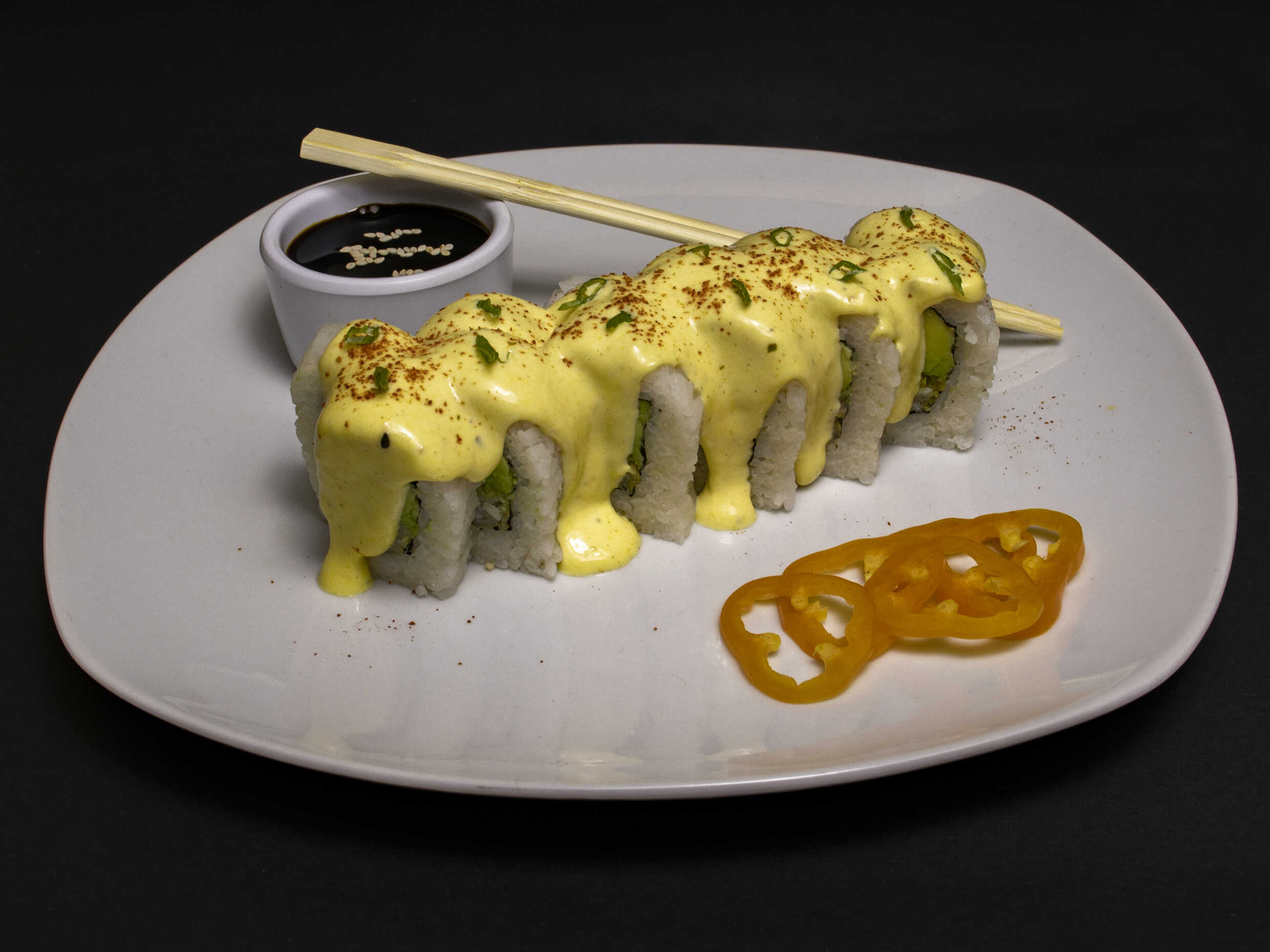 palta, pescado bañado en salsa spacy picante sopleteado