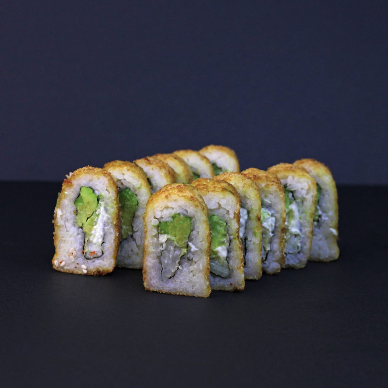 Queso crema y pescado furai con palta cubierto de ajonjolí.