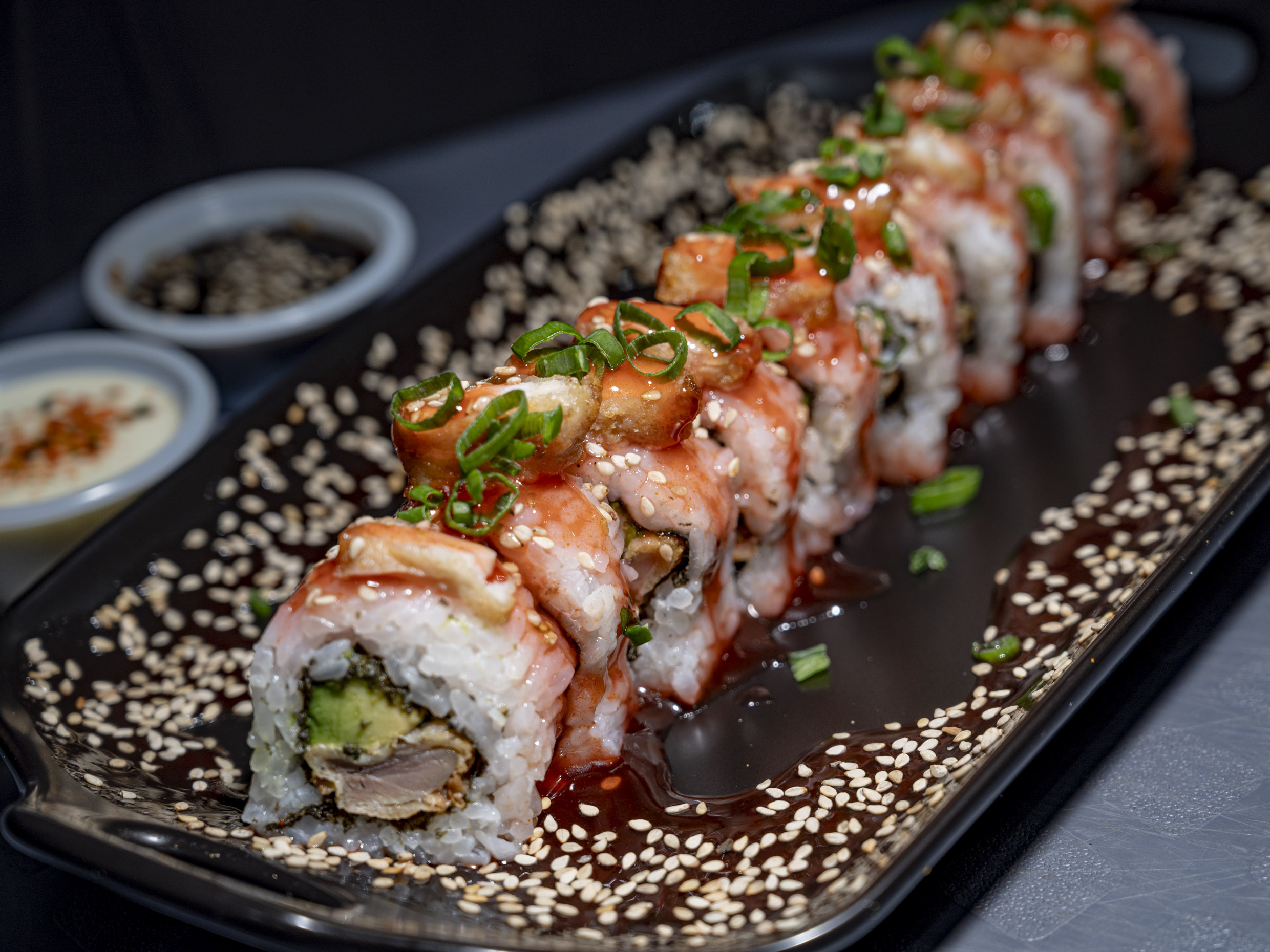 Maki de relleno clásico con pulpa de cangrejo, bañado en salsa spicy y teriyaki.