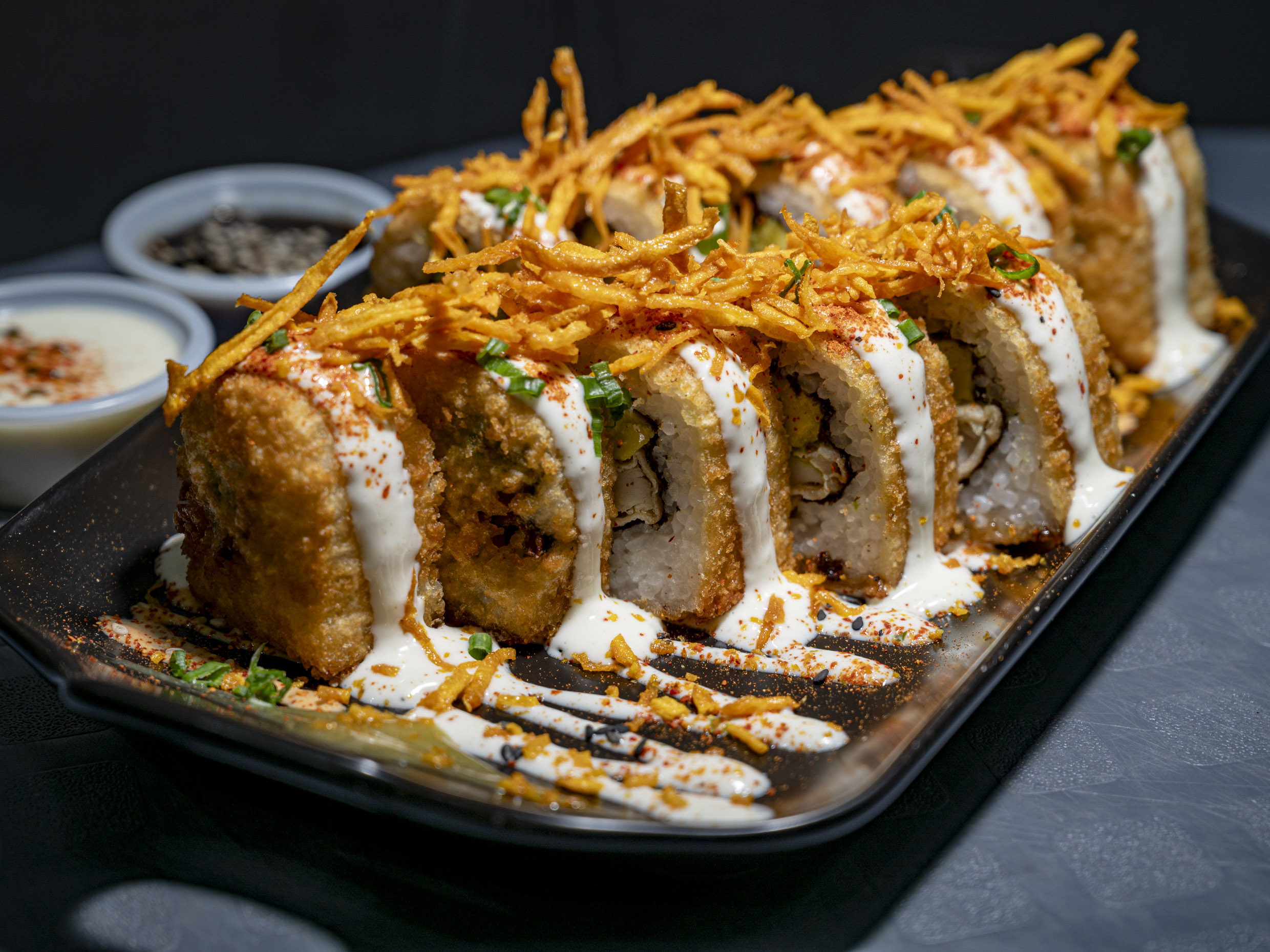 Nori empanizado, relleno de pescado y queso crema, encimado de pulpa de cangrejo, teriyaki y acevichada.