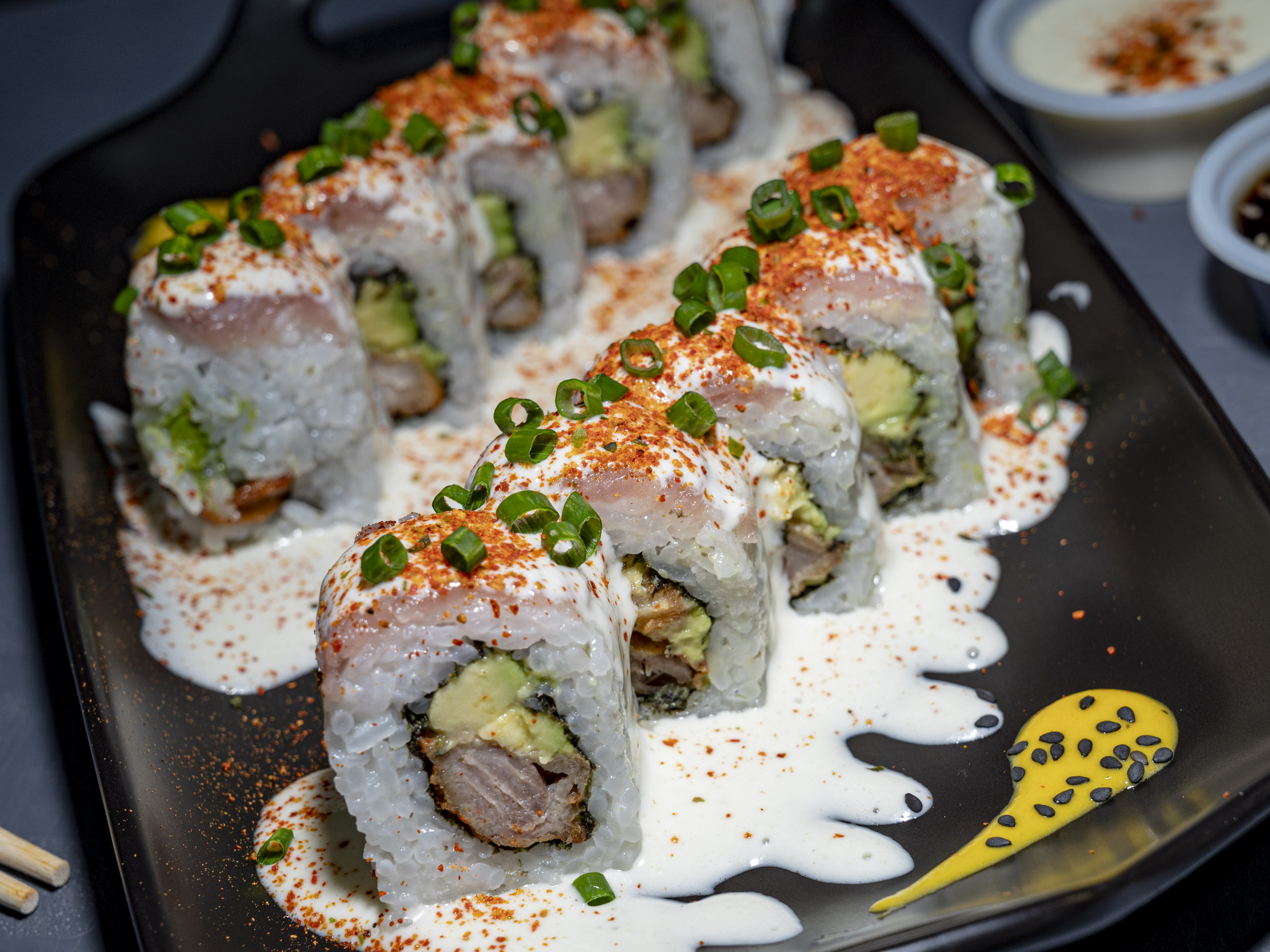 Maki de relleno clásico con pulpa de cangrejo, bañado en salsa spicy y teriyaki.