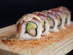 Relleno de pescado, palta y nori, en pulpa de pescado con salsa spicy con trozos de langostino furai.