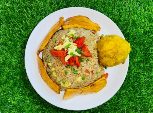 Porción de chaufa con su bola de tacacho de plátano bellaco.