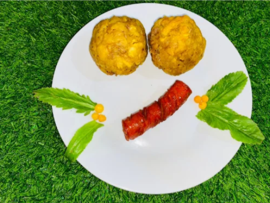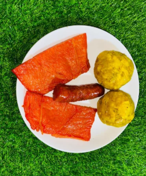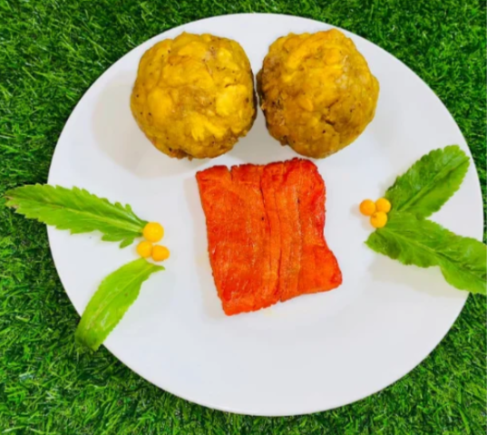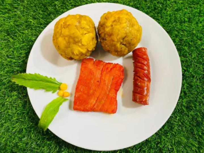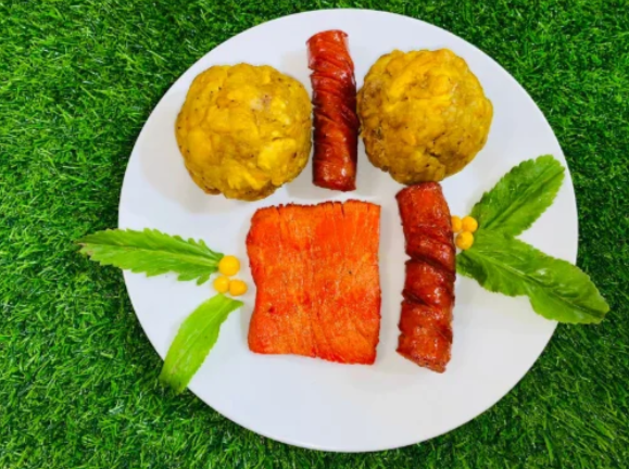 2 Bolas de plátano bellaco verde con 1 cecina de 100 g, 2 chorizos de 80 g y ensalada de cocona de la casa.