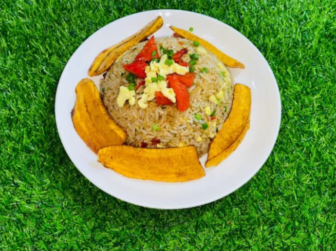 Arroz chaufa de cecina picada ahumada con huevo, cebolla china, pimentón y maduro frito.