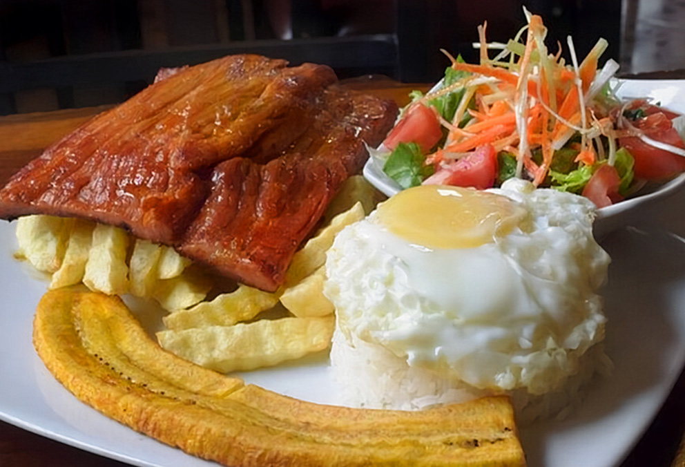 Filete de cecina, papas fritas a la francesa, arroz de la casa, plátano frito y huevo.