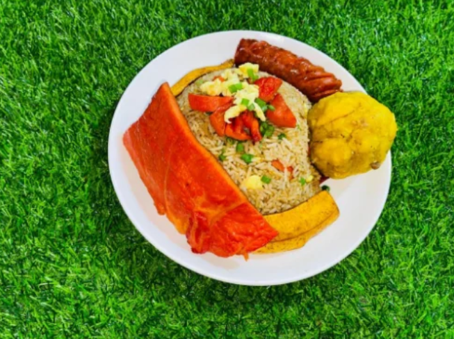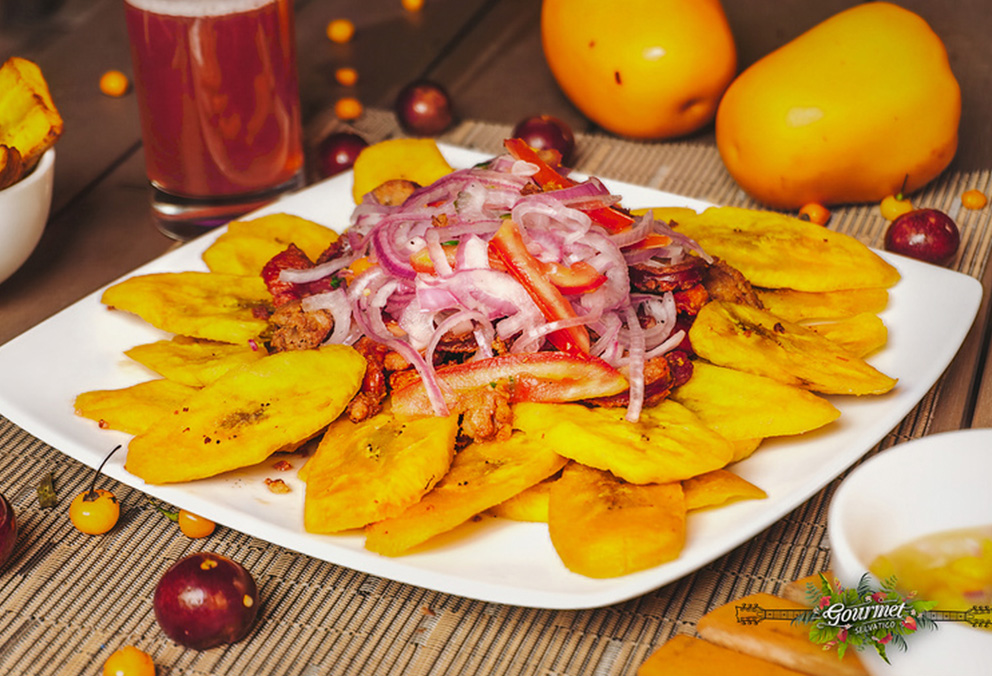 Chaufa de cecina, 2 bolas de tacacho de cecina, cecina, chorizo y maduro.