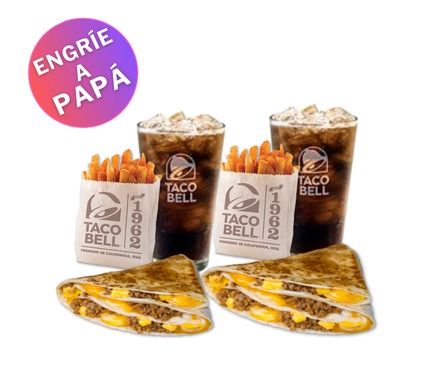 Crunchy taco, burrito supreme, quesadilla de queso, porción de papas o nachos regular y bebida a elección.