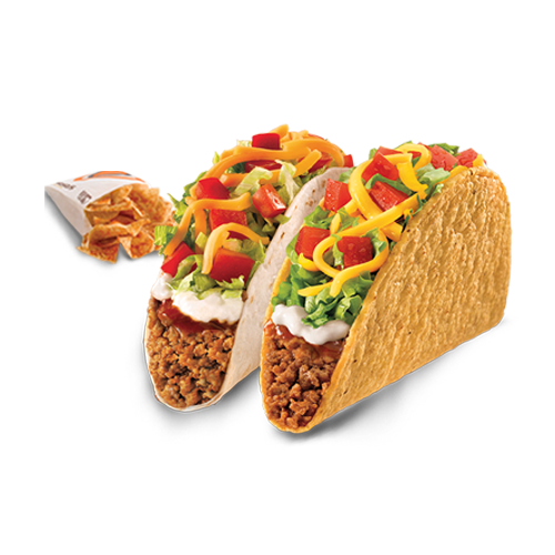 2 Crunchy Tacos supreme, porción de papas o nachos regulares y bebida a elección.