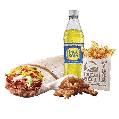 Crunchy taco supreme, cheesy burrito (con un toque picante), porción de papas o nachos regulares y bebida a elección.