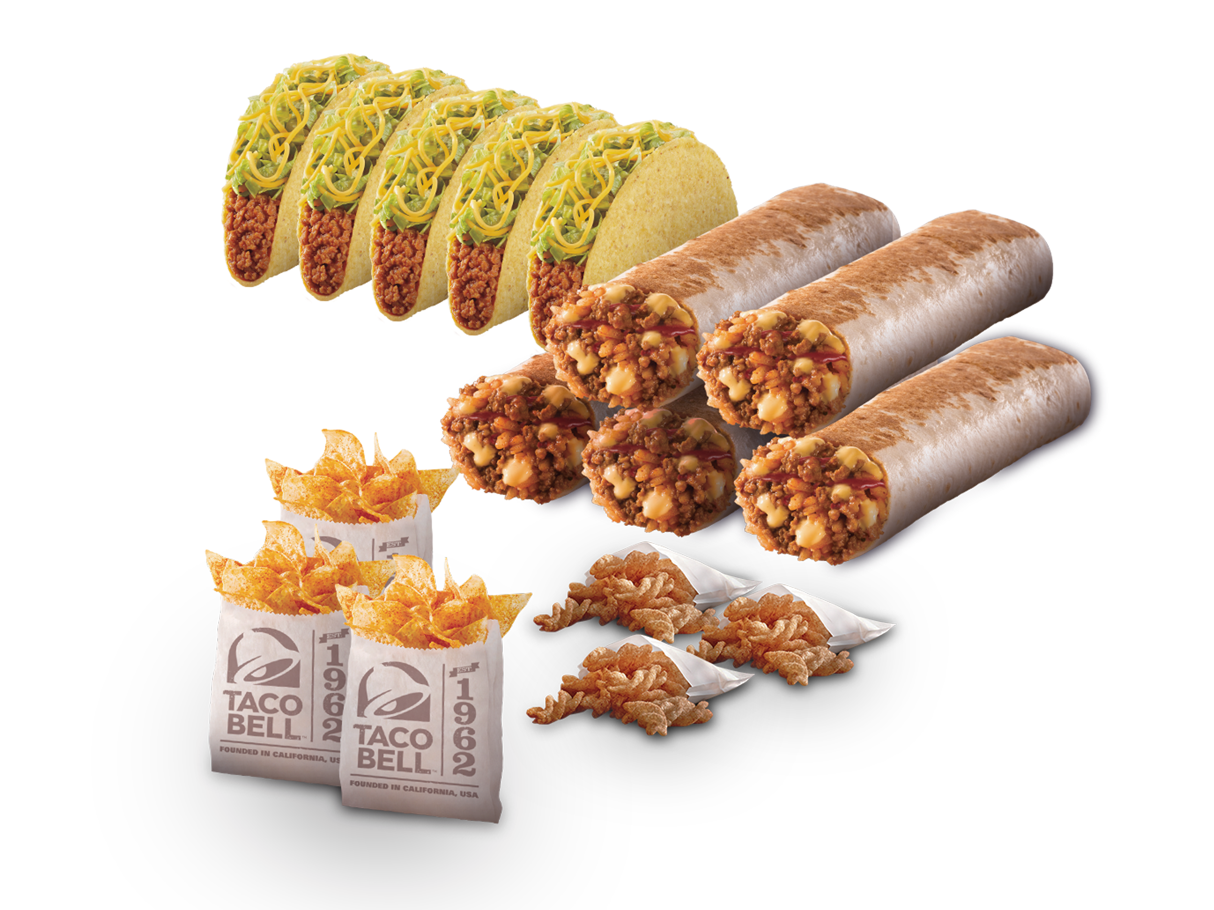 5 Crunchy tacos de carne molida, 5 cheesy burritos de carne molida, 3 porciones de nachos y 3 porciones de flauta de manjar